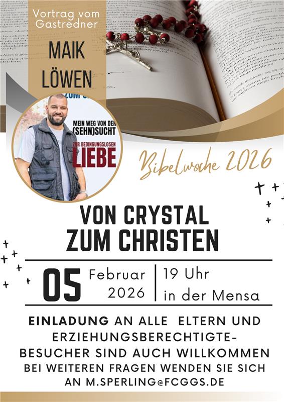 Herzliche Einladung zu einem besonderen Vortragsabend im Rahmen der Bibelwoche für alle Eltern und Sorgeberechtigten sowie interessierte Besucher. Am Donnerstagabend, dem 05. Februar, um 19:00 Uhr, wird Maik Löwen in der Mensa unserer Schule über seine bewegte Vergangenheit berichten und darüber sprechen, was die große Wende in seinem Leben herbeigeführt hat. Kleiner Spoiler: Ja, der Glaube an…