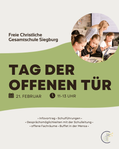 Für alle diejenigen, die den ersten „Tag der offenen Tür“ im November des vergangenen Jahres verpasst haben, bietet sich am Samstag, den 21.02.2026 erneut die Gelegenheit, denn die Freie Christliche Gesamtschule lädt alle Interessierten zwischen 11:00 Uhr und 13:00 Uhr herzlich in ihre Schulräume ein.