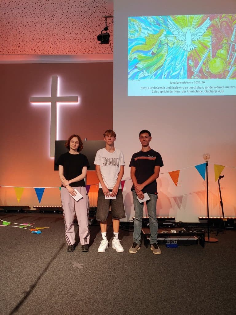 um Schuljahresende fand wie gewohnt der Abschlussgottesdienst statt und wieder einmal war die Evangelische Freikirche Siegburg so freundlich und stellte hierfür ihre Räumlichkeiten zur Verfügung. In diesem Rahmen wurden auch die drei Gewinner des ausgelobten Kunstwettbewerbes zur Gestaltung des Schuljahresleitverses geehrt…
