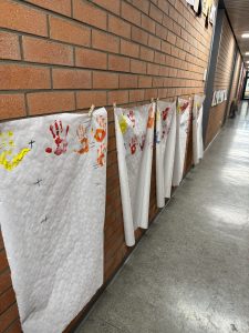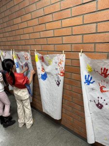 Den Schaffensprozess sowie das Ergebnis der „Farbstudie“ druckten Sie per Handstempel auf Papier, sodass der Unterricht anschaulich und bunt und der gesamte Flur zum Ausstellungsraum wurde – Lernen mit allen Sinnen! 🎨🖐️