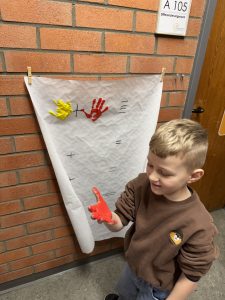 Ganz praktisch lernten sie, wie aus z.B. gelber und roter Farbe orange entsteht: Sie bemalten ihre Hände jeweils mit einer der Farben und rieben sie anschließend aneinander. Mit viel Spaß und Staunen entstand so die neue dritte Farbe.