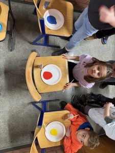 Kleine Farb-Künstler haben sich diese Woche den Grundschul-Flur zu Eigen gemacht und eine Galerie an Kunstwerken produziert. Ziel der Unterrichststunde war es, zu erkunden, wie Farben gemischt werden können um neue Farben zu erhalten. Mit ganzem Eifer waren die Kinder dabei und entdeckten spielerisch die Welt der Farben.