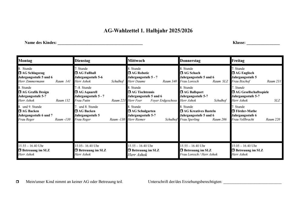 Der reguläre Unterricht findet zwischen 8:15 Uhr und 14:10 Uhr statt (an drei Tagen bis 15:00 Uhr), das Nachmittagsangebot ist bis 16:30 Uhr verfügbar.
